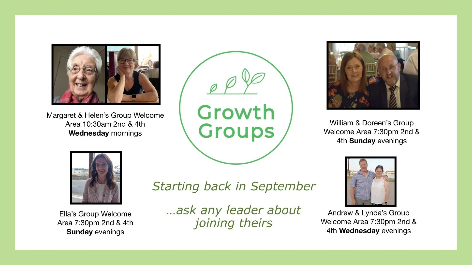 Growth Groups are a great way to grow in your faith. They’re led by members of our church and meet at different times of the week. Typically we take a passage of the Bible and study it together. It’s an enjoyable way to learn the Scripture.